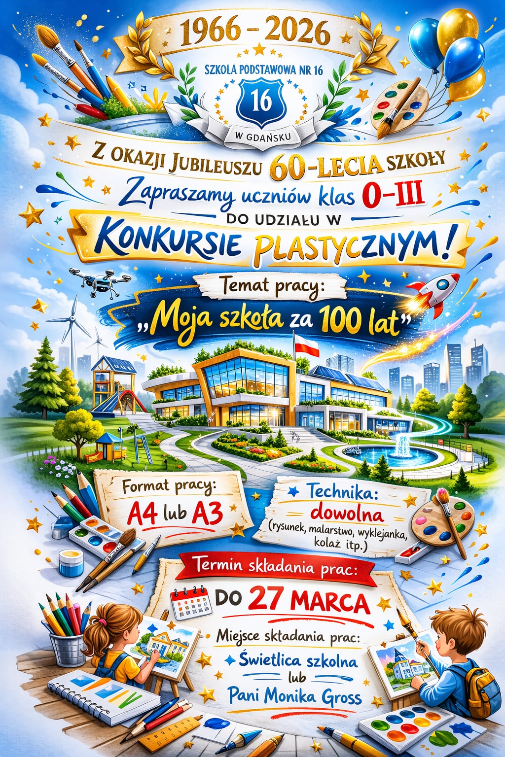 Konkurs plastyczny " Moja Szkoła za 100 lat " - Szkoła Podstawowa nr 16 im. Władysława Broniewskiego