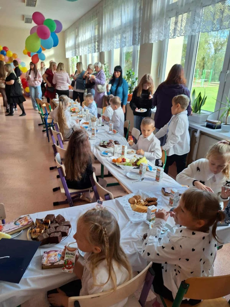 Po uroczystości na świeżo upieczonych uczniów w holu na parterze czekała słodka niespodzianka oraz upominki przygotowane przez rodziców.